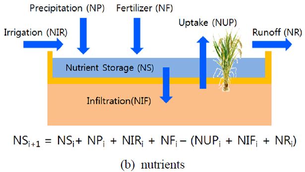 우리나라의 경우 밀도 높은 토지이용으로 인하여 하나의 유역 내에 농촌지역과 도시지역이 함께 위치하는 경우가 많다. 따라서 유역모델을 국내에 적용하기 위해서는 농촌지역과 도시지역을 함께 모의할 수 있어야 한다. 우리나라의 농촌유역은 논농사 중심으로 물의 저류와 관개가 빈번하게 수행되며, 이를 위해 하천에 배수문, 보 등의 인위적 수리 시설물이 산재하는 특징을 갖는다. 논에서는 강우 및 관개에 의해 논에 유입된 유량이 증발산과 침투를 통해 손실된 후, 남은 물의 높이가 물꼬높이보다 높으면 유출이 발생한다. 이는 영양물질 변환과 이동 등의 물질수지에도 영향을 미친다. 외국에서 개발된 대부분의 유역모델은 논에서의 수문과정을 고려하지 못하는 한계를 갖는다. 이를 개선하기 위해 논에서의 수문과정을 고려한 국내 연구로는 Kim et al. (2003), Jeon et al. (2007) 등의 연구가 있다. 이 중 Jeon et ad. (2007)은 HSPF에 기반하여 논에서의 담수능력과 시비에 의한 영양물질 농도변화를 모의하기 위한 HSPFPaddy 모델을 개발하였으며, Kim et al. (2014)은 보청천 유역에 대해 HSPF-Paddy의 적용성을 평가하였다. 논에 대한 STREAM에서의 유량 및 영양물질 수지를 모식도로 나타내면 Fig. 7과 같다.